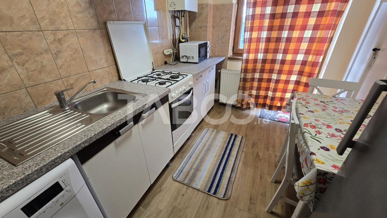 TABOO Imobiliare propune un apartament de inchiriat cu 2 camere, decomandat, situat in localitatea Sibiu, zona Central, aflat la etajul 3 intr -un imobil tip bloc cu regim de inaltime pe Parter + 4 Etaje; anul constructiei 1970, structura caramida. Suprafata utila de 54 mp + balcon de 10 mp.
