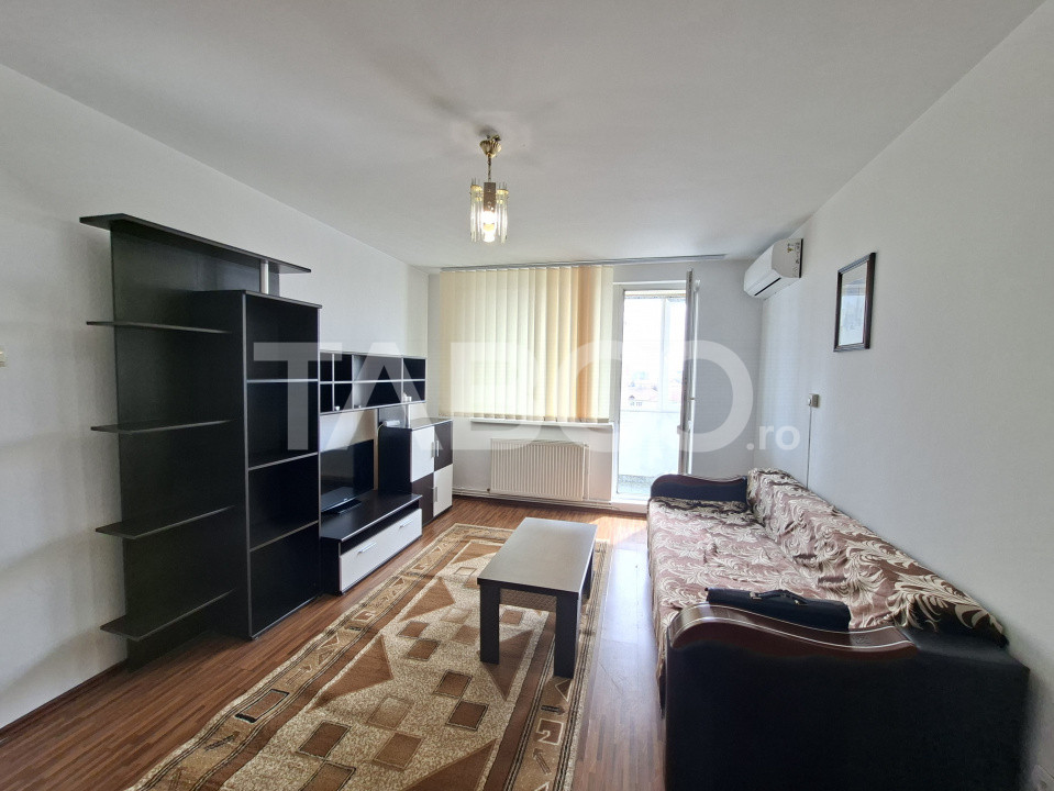 TABOO Imobiliare propune un apartament de inchiriat cu 2 camere, semidecomandat, situat in localitatea Sibiu, zona Mihai Viteazul, aflat la etajul 8 intr -un imobil tip bloc cu regim de inaltime pe Parter + 10 Etaje; anul constructiei 1970, structura beton. Suprafata utila de 48 mp + balcon de 4 mp