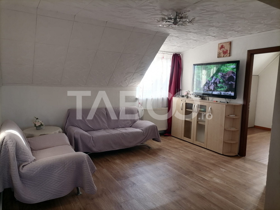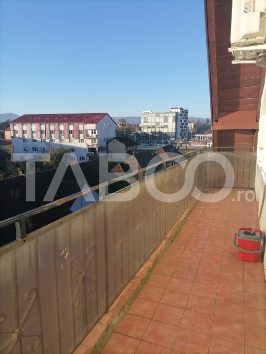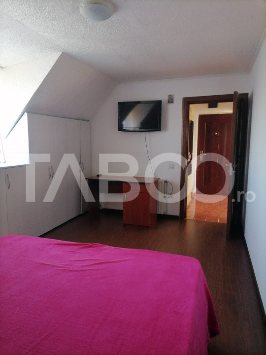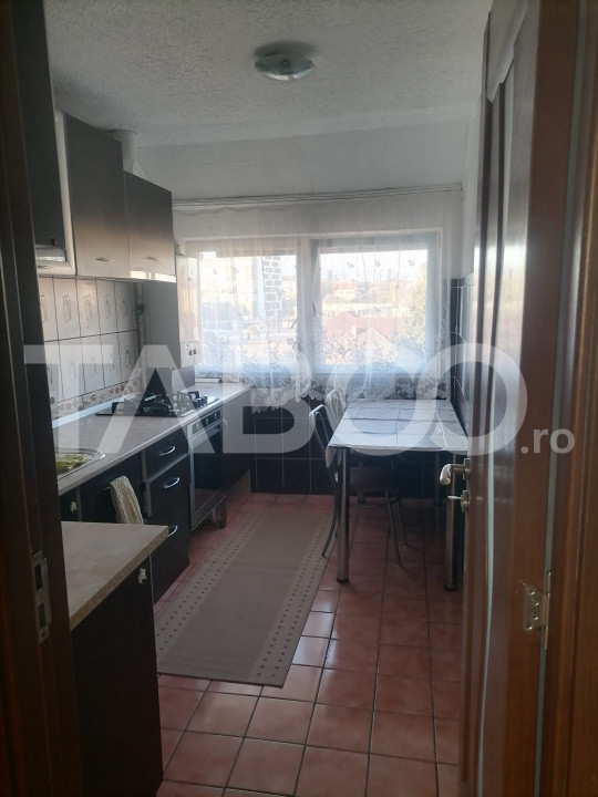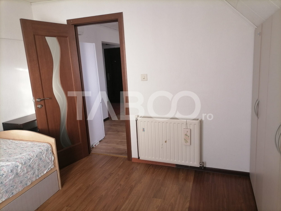 TABOO Imobiliare propune un apartament de inchiriat cu 3 camere, decomandat, situat in localitatea Sibiu, zona Trei Stejari, aflat la Mansarda intr -un imobil tip bloc cu regim de inaltime pe Parter + 3 Etaje + Mansarda; anul constructiei 2000, structura caramida. Suprafata utila de 60 mp + balcon de 8 mp.