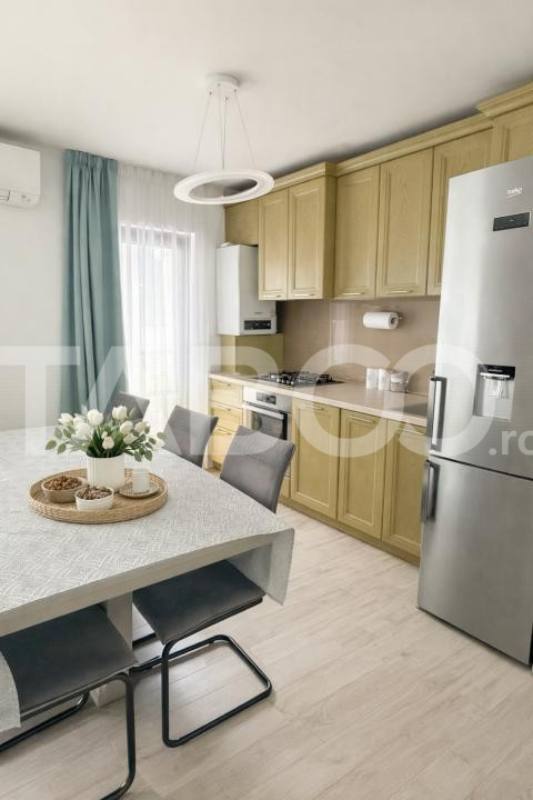 Apartamentul se vinde mobilat si utilat cu: plita pe gaz, cuptor, hota, masina de spalat rufe, uscator rufe, masina de spalat vase, frigider cu congelator, cuptor cu microunde, espressor de cafea.