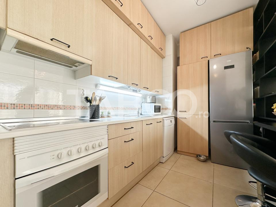 Apartamentul se vinde mobilat si utilat cu: plita electrica, cuptor, hota, masina de spalat rufe, frigider cu congelator, masina de spalat vase.