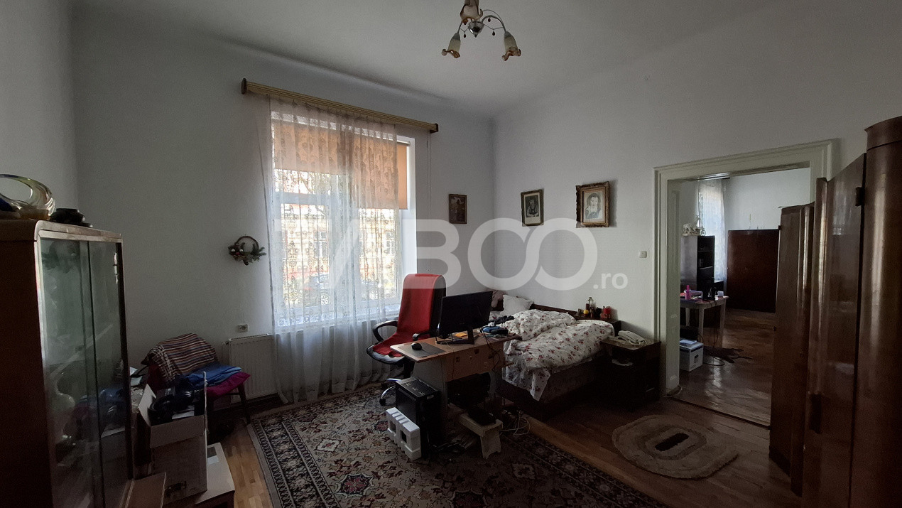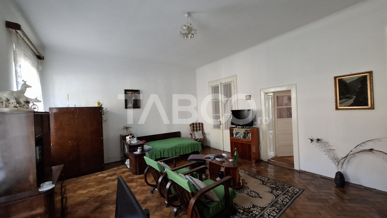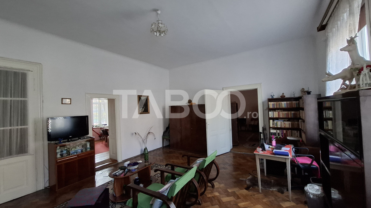 TABOO Imobiliare propune un apartament de vanzare cu 4 camere, circular, situat in localitatea Sibiu, zona Central, aflat la etajul P intr -un imobil tip vila cu regim de inaltime pe Parter + 2 Etaje; anul constructiei 1950, structura caramida. Suprafata utila de 113 mp + cota parte din terenul total aferent de 1400 mp