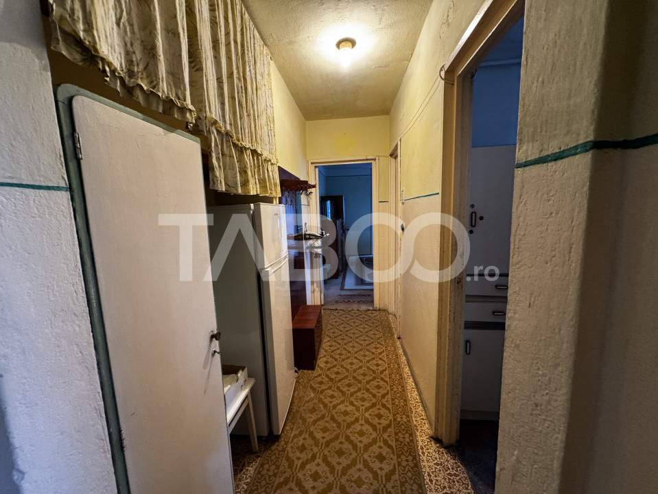 TABOO Imobiliare propune un apartament de vanzare cu 3 camere, semidecomandat, situat in localitatea Sibiu, zona Mihai Viteazul, aflat la etajul 3 intr -un imobil tip bloc cu regim de inaltime pe Parter + 4 Etaje; anul constructiei 1980, structura beton. Suprafata utila de 46 mp + balcon de 4 mp.