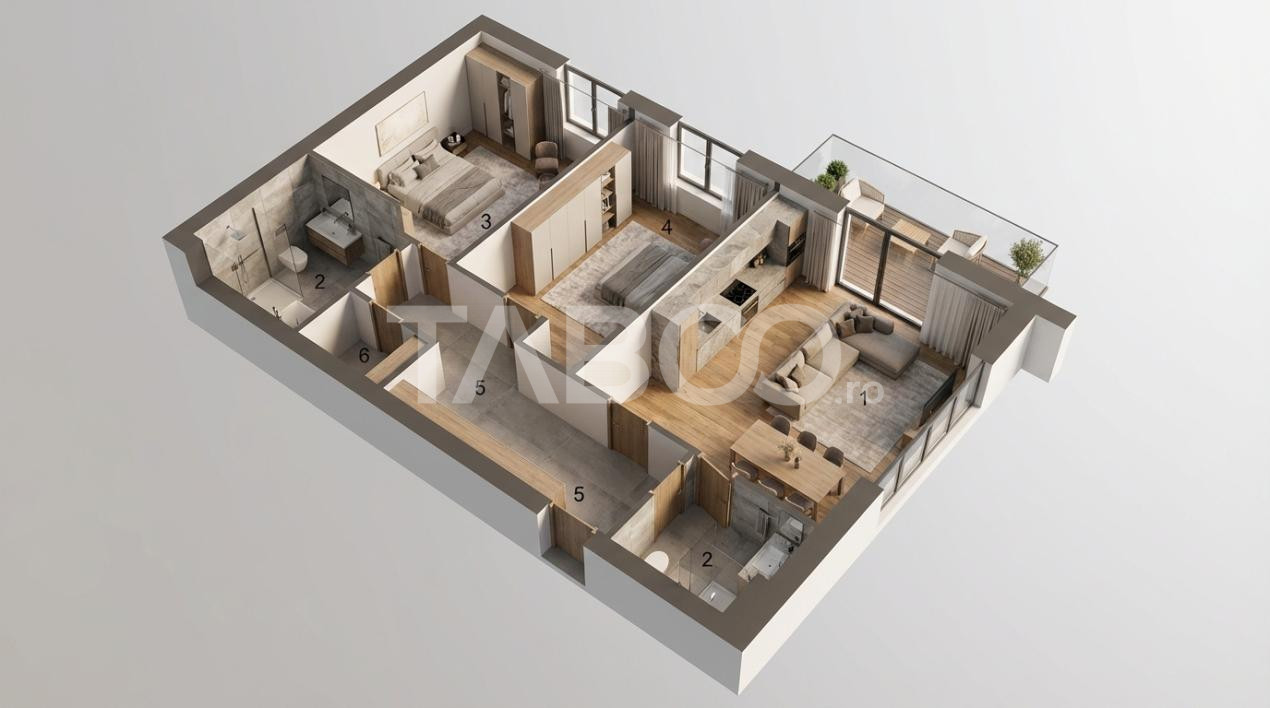 TABOO Imobiliare propune un apartament de vanzare cu 3 camere, semidecomandat, situat in localitatea Sibiu, zona Turnisor, aflat la etajul parter intr -un imobil tip bloc cu regim de inaltime pe Parter + 2 Etaje; anul constructiei 2000, structura caramida. Suprafata utila de 70 mp + balcon de 5 mp. Imobilul dispune de o curte comuna si un parc pentru copii.