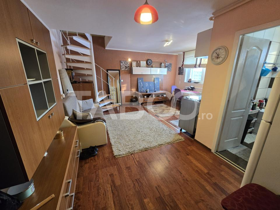 TABOO Imobiliare propune un apartament de vanzare cu 3 camere, semidecomandat, situat in localitatea Sibiu, zona Valea Aurie, aflat la mandarda intr-un imobil tip bloc cu regimul de inaltime P+4+M, anul constructiei 2008, pe structura din bca, cu suprafata utila de 56 mp.