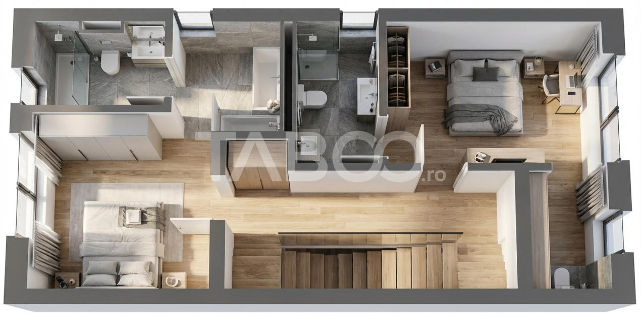 ~ Etaj: hol, 2 dormitoare, 2 dressinguri si 2 bai;