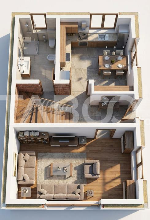 La parterul casei vei gasi un living spatios, un dressing, o baie moderna cu dus si o bucatarie inchisa cu acces la camara.