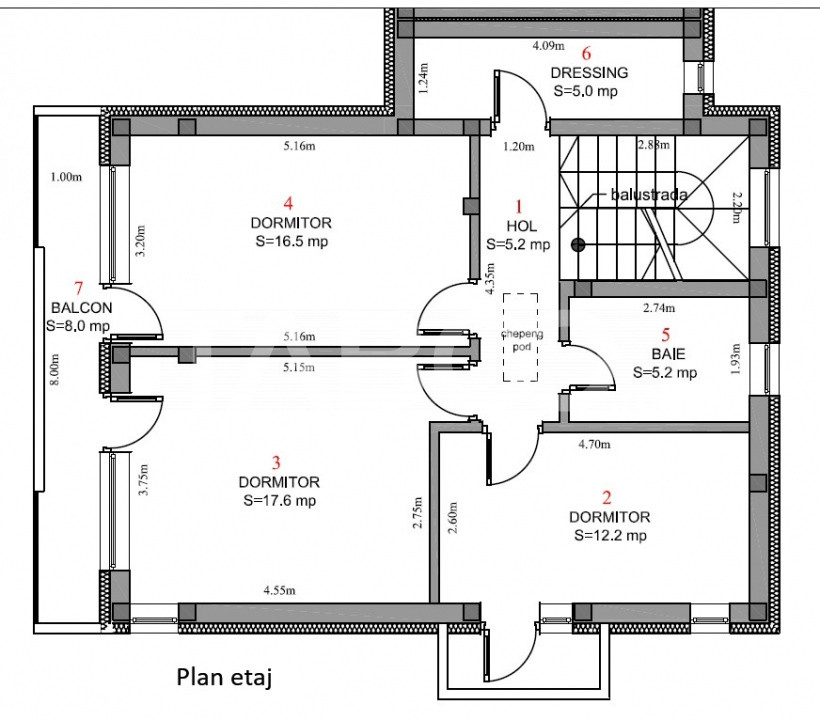 ~ Etaj: hol, 2 dormitoare cu balcon comun, dormitor cu balcon separat, dressing si baie;
