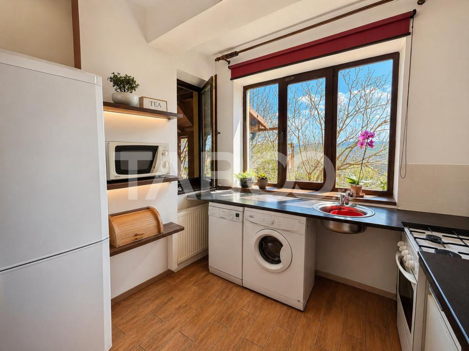 Casa este mobilata si utilata: aragaz, cuptor, hota, aragaz, masina de spalat rufe, masina de spalat vase, frigider cu congelator.