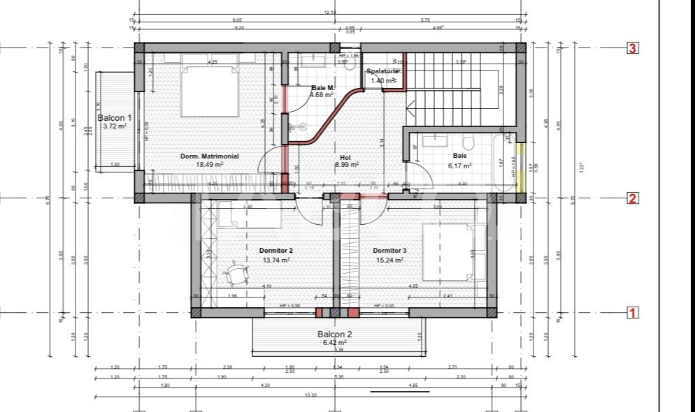 Etaj/Mansardă: hol, 3 dormitoare, 2 bai și 2 balcoane
