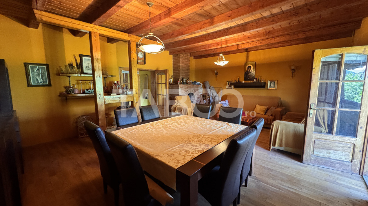 Doresti sa achizionezi o locuinta linistita? Vrei o casa cu 6 camere in Cornatel? Aceasta casa de vanzare cu 6 camere in Cornatel este alegerea potrivita pentru tine si familia ta. Casa de vanzare cu 6 camere din Cornatel are suprafata construita de 414 mp si suprafata utila a casei de 340 mp. Structura cladirii este din beton, are sistem de incalzire cu centrala proprie, soba teracota, calorifere, semineu. Casa are un stil clasic si elegant si este de vanzare complet mobilata si utilata. Imobilul are o curte libera de 441 mp cu locuri de parcare, spatiu pentru zona de joaca a copiilor si terasa frumos amenajata. Imobilul este situat in Cornatel, la 15 minute de orasul Sibiu.