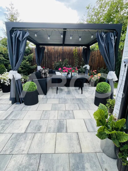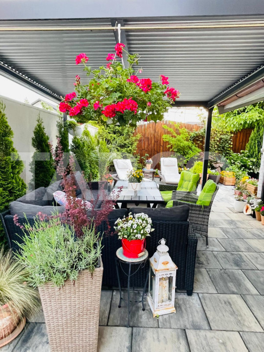 Casa are o curte libera de 230 mp, loc pentru zona de joaca a copiilor, o terasa de relaxare si gradina. Accesul la etajul vilei se face prin scara interioara, cu balustrada de fier.