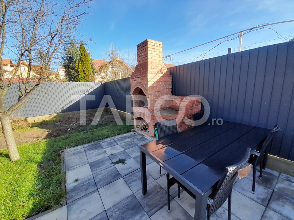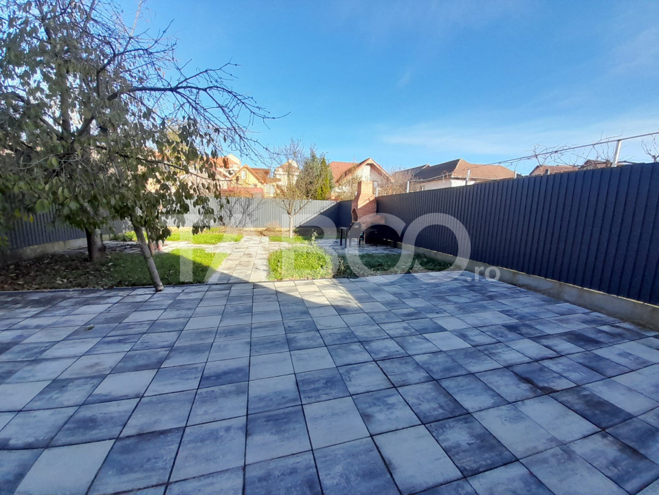 In partea exerioara a casei se afla o curte libera de 266 mp, 2 locuri de parcare in garaj acoperit, loc pentru zona de joaca a copiilor, 1 gratar de caramidal. Vila este izolata cu vata bazaltica de 10 cm, finisata si cu piatra decorativa, si detine panouri solare pentru apa. Pe teren, recent construita, se mai gaseste o casa individuala cu o suprafata de 45 mp, incluzand camera, bucatarie si baie.