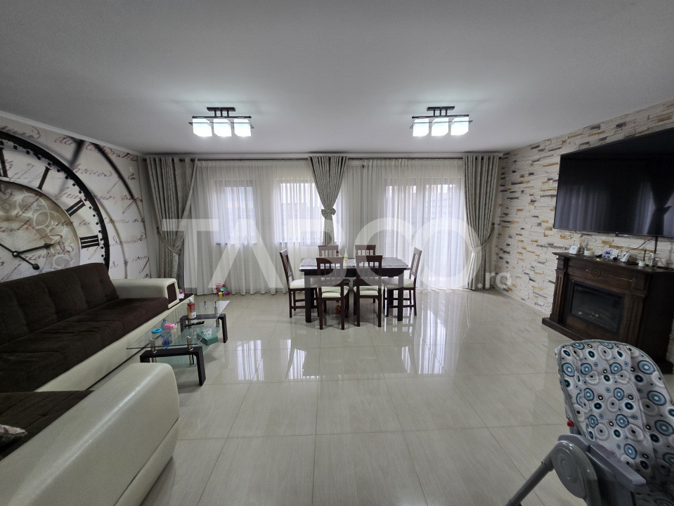 Incalzirea casei se realizeaza prin centrala propie + incalzire in pardoseala, casa este izolata termic. Se vinde mobilata si utilata, iar finisajele interioare sunt moderne, cu usa de termopan la intrare, usi din lemn la interior, ferestre din pvc cu termopan, podele cu parchet si gresie, iar peretii cu vopsea lavabila si faianta, curent electric, gaz, canalizare, contorizare separata, frigider, masina de spalat rufe, masina de spalat vase, cuptor, hota, cafetiera.