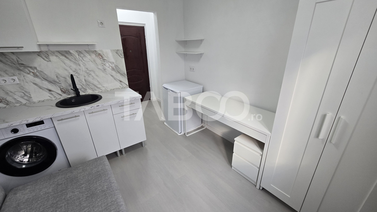 Garsoniera se inchiriaza mobilata si utilata cu: plita electrica, masina de spalat rufe, frigider cu congelator.