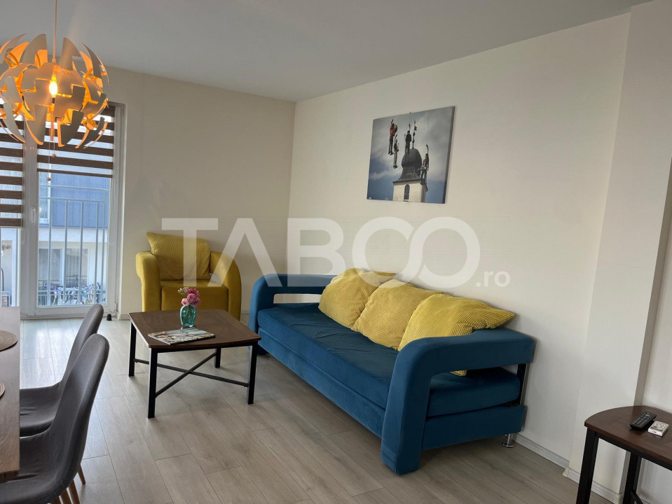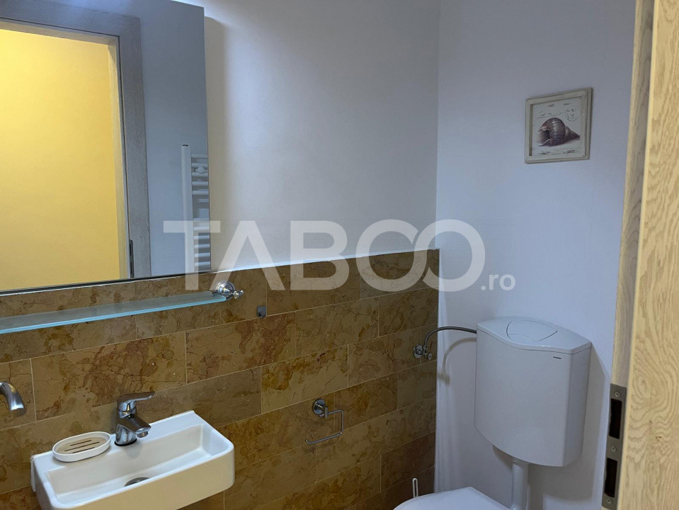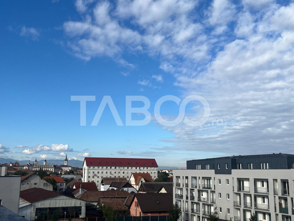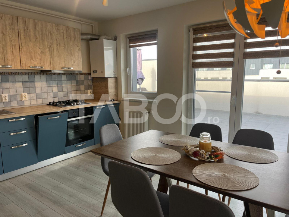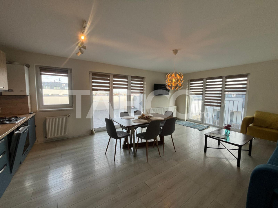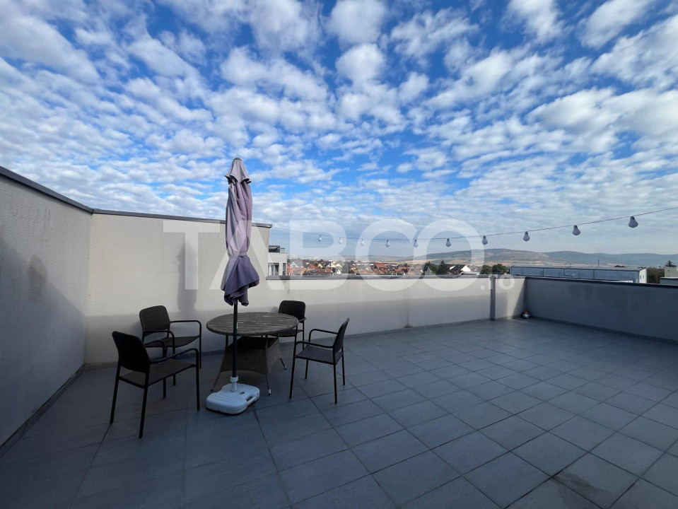 TABOO Imobiliare propune un penthouse de inchiriat cu 3 camere, decomandat, situat in localitatea Sibiu, zona Lupeni, aflat la etajul retras intr -un imobil tip bloc cu regim de inaltime pe Parter + 3 Etaje + etaj retras ; anul constructiei 2022, structura caramida. Suprafata utila de 76 mp + terasa de 46 mp .