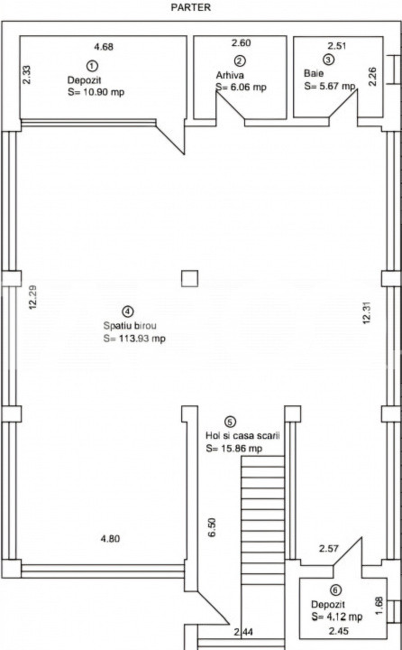 • Spatiu deschis, foarte generos de 113 mp care poate fi amenajat sau compartimentat dupa necesitati cat si alte 3 incaperi deja delimitate: doua spatii de depozitare, arhiva si o baie.