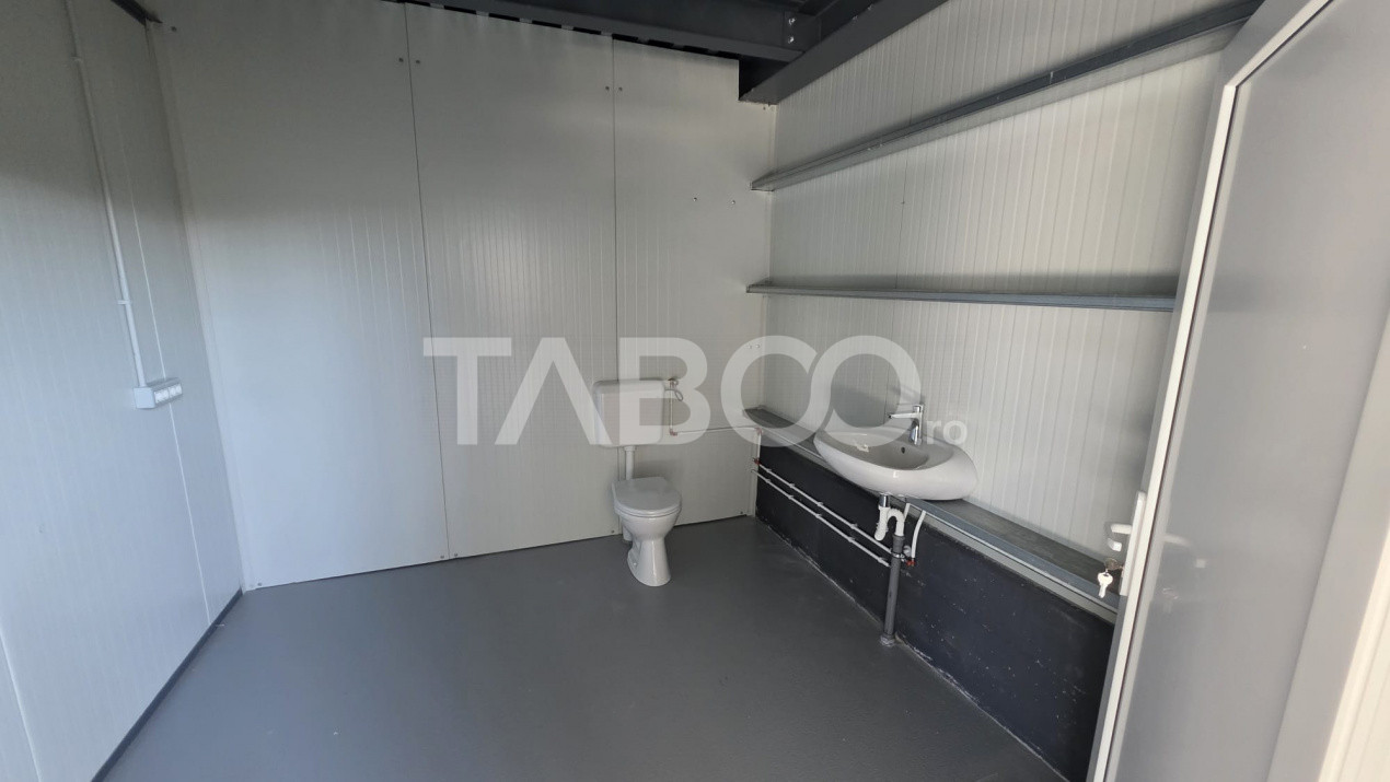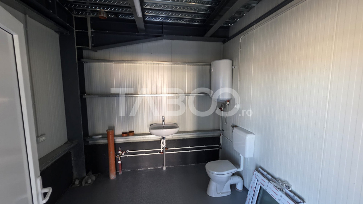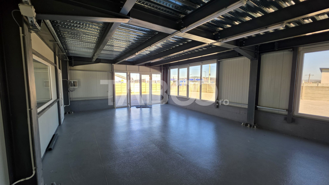 Suprafata totala a terenului este de 1300 mp, curte pavata si ingradita cu gard din beton, iar cladirea in suprafata totala de 360 mp, cu 2 porti acces TIR este compartimentata astfel:un open-space de 250 mp, 3 birouri si 2 grupuri sociale.